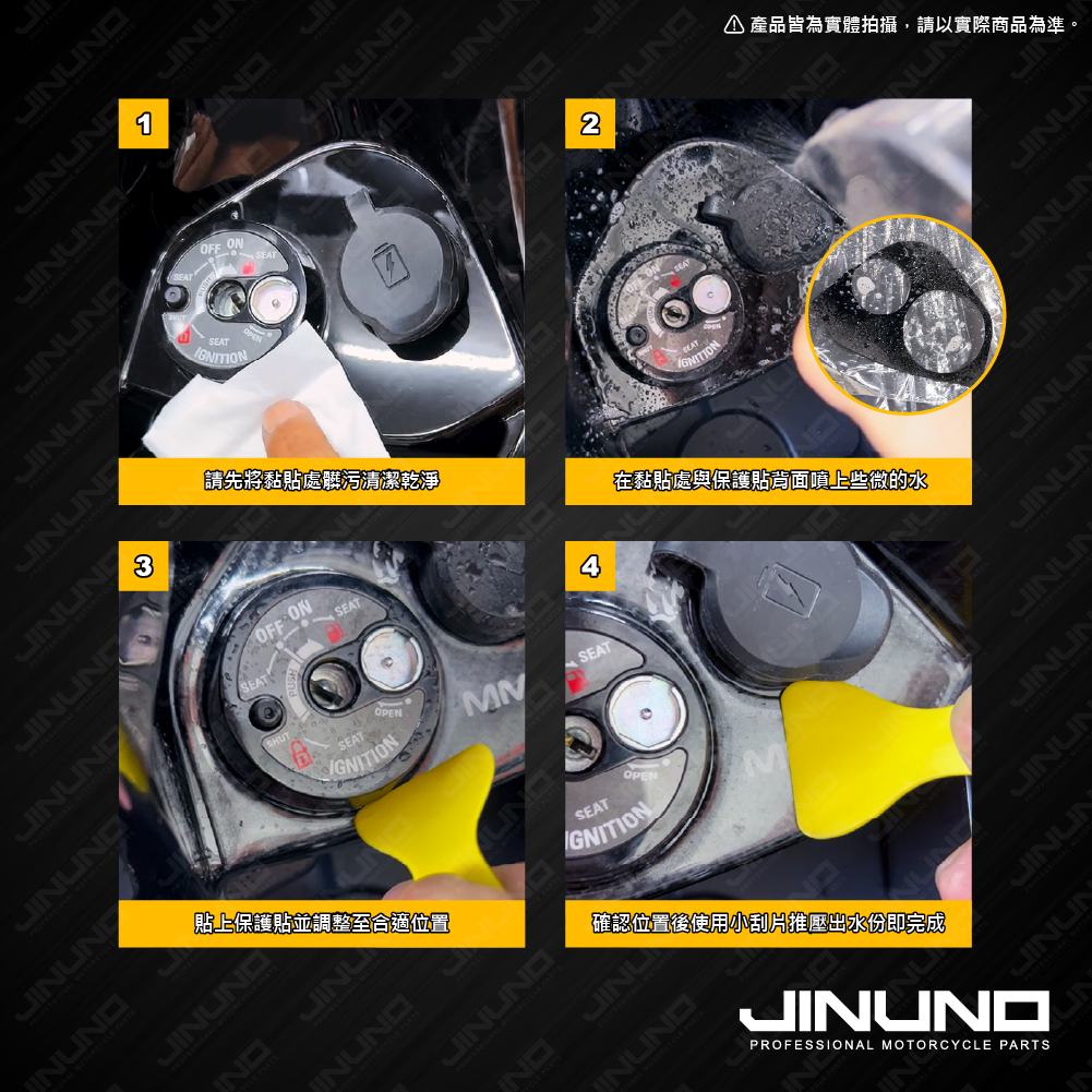 確認好貼點位置及方向,搭配隨附刮板推壓輔助黏貼